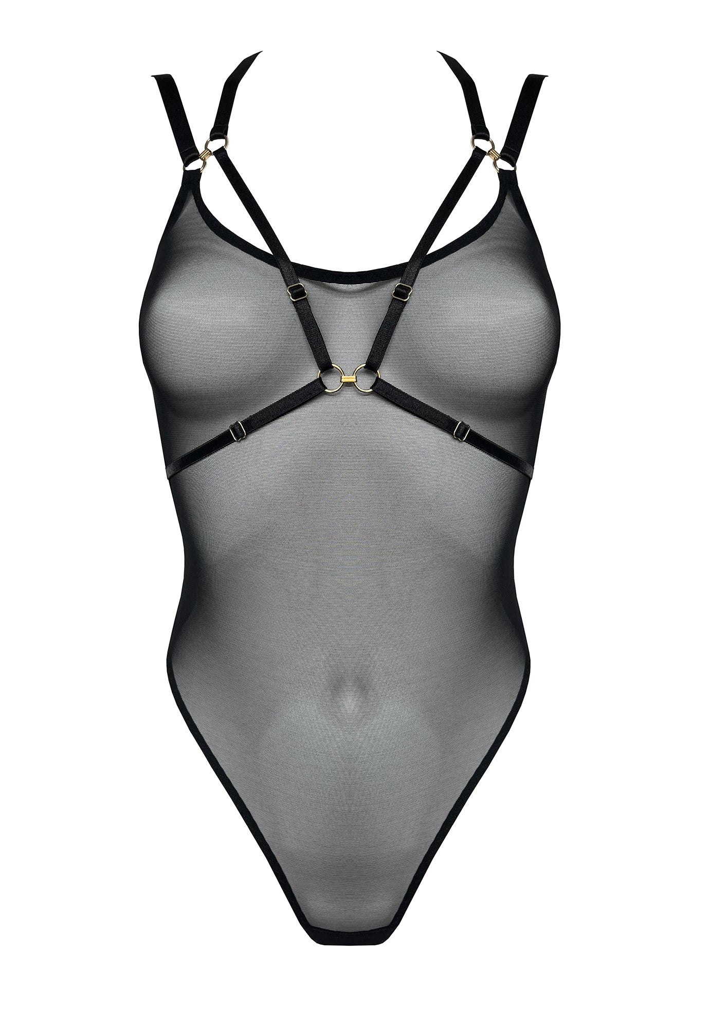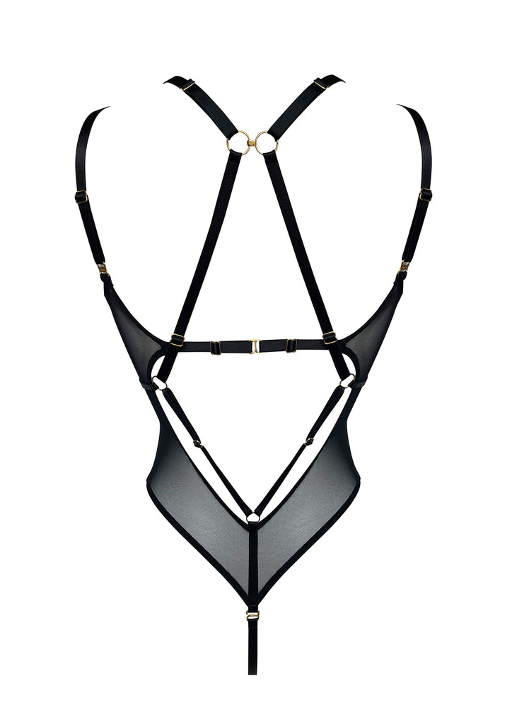 Bordelle Vero Harness Body crafted with soft, sheer mesh featuring a delicate satin elastic harness and 24k gold plated chain-link component details. Adjustable strapping highlights the bust and continues to the back to create an eye-catching design, securing at the back with a swan hook and ring-hook fastening.