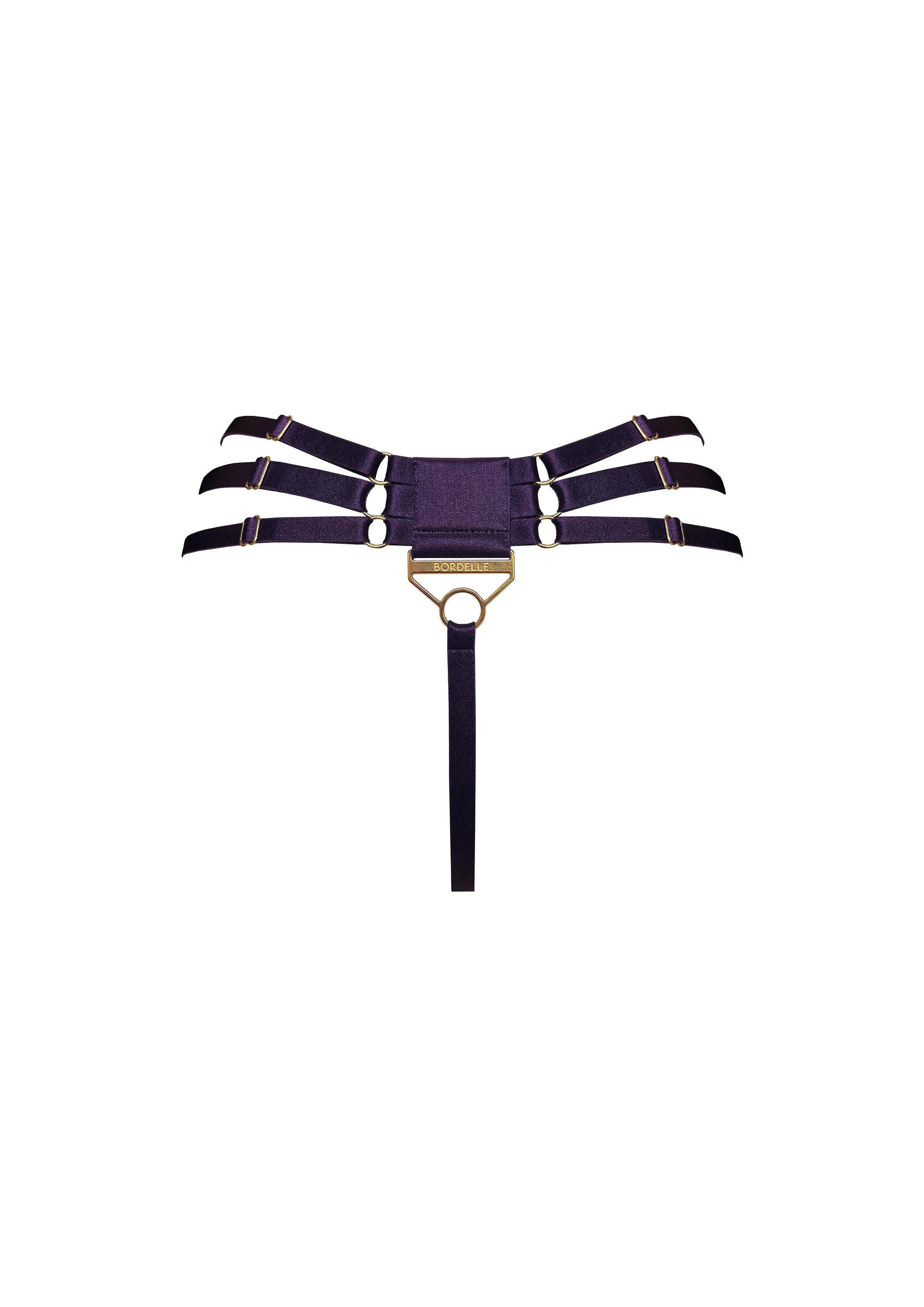 Bordelle Retta Multi-Strap Thong is a soft mesh thong with a flattering ‘V’ shape front panel and satin elastic harness detailing. Featuring 6 adjustable straps that can be moved and placed over the hips for personalised styling, finishing at the back with an oversized 24k gold plated branded component.