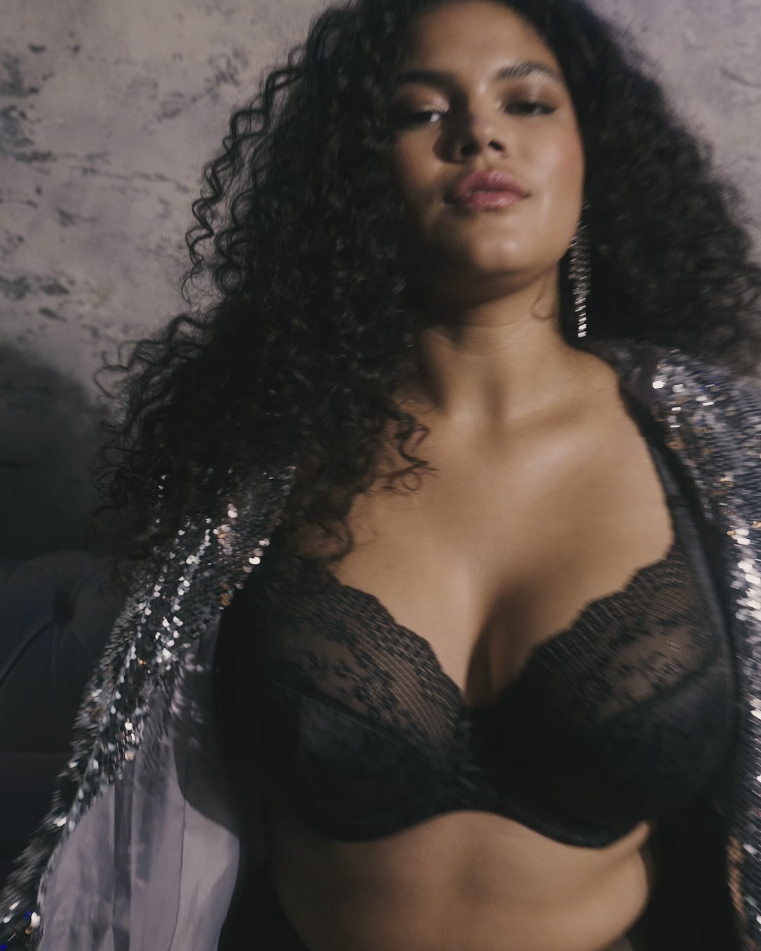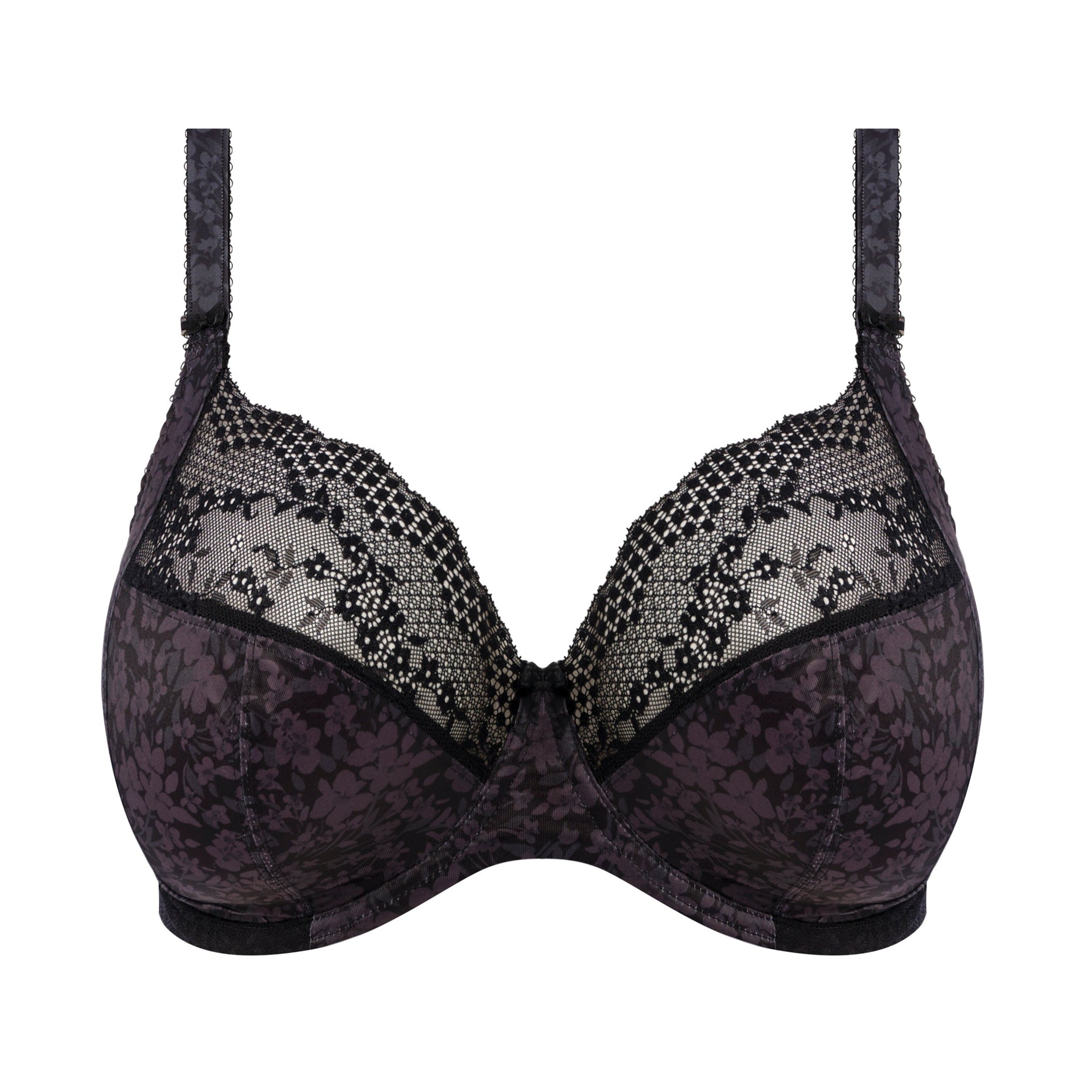 Discover the Elomi Lucie Plunge Bra in black print. Featuring a dark black base, the three section printed cups, plus side support panel create a beautiful and natural shape. Whilst the neck edge is designed to create a smooth and seamless finish when worn.
