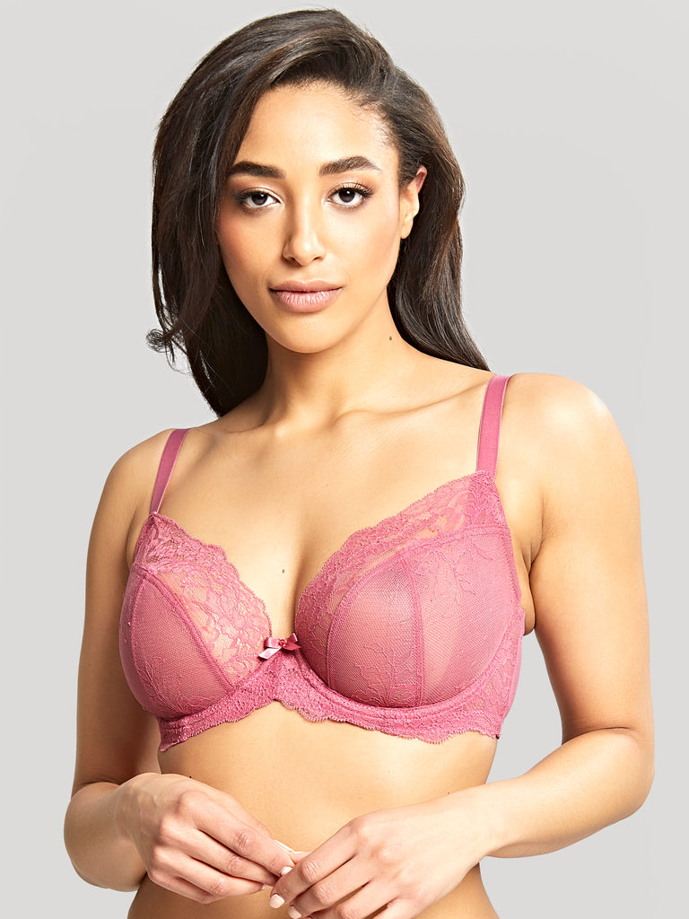 Panache Ana Plunge Bra in berry pink features pretty stretch lace for ease of fit. This 3-part deep-plunge cup is styled with power-mesh wings, an inner side sling as well as a reinforced bottom in the cups. This delicate-looking plunge bra provides comfortable support around the body and an uplifted fit for fuller busts.