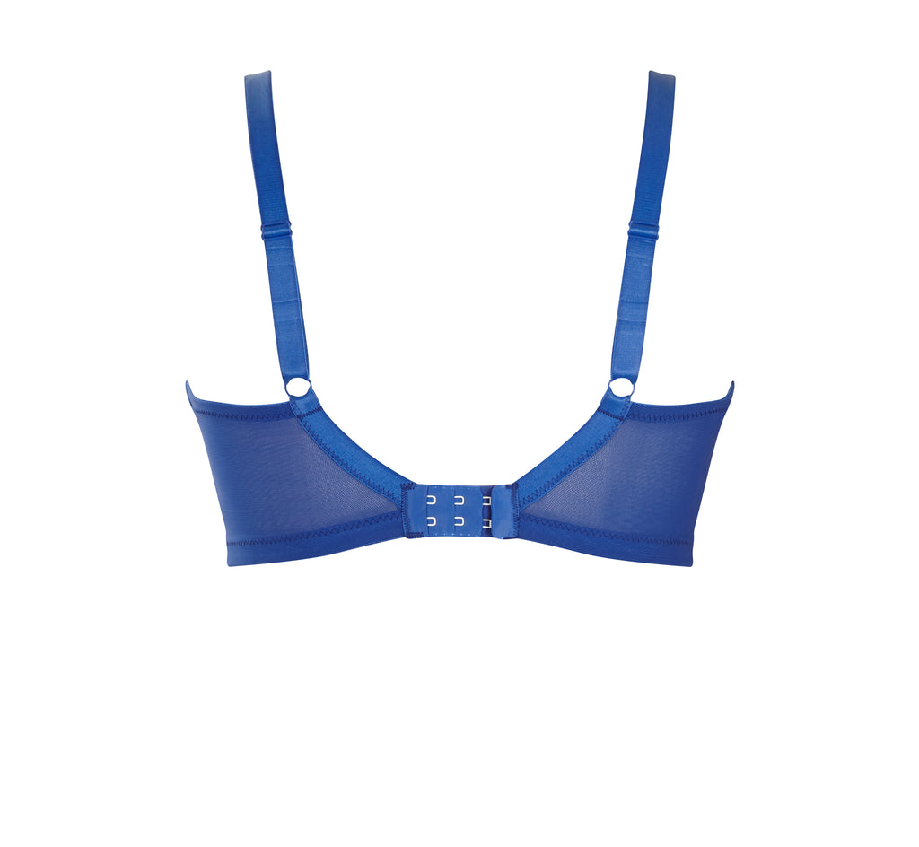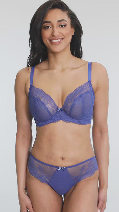 Panache Ana Plunge Bra in blue jewel features pretty stretch lace for ease of fit. This 3-part deep-plunge cup is styled with power-mesh wings, an inner side sling as well as a reinforced bottom in the cups. This delicate-looking plunge bra provides comfortable support around the body and an uplifted fit for fuller busts.