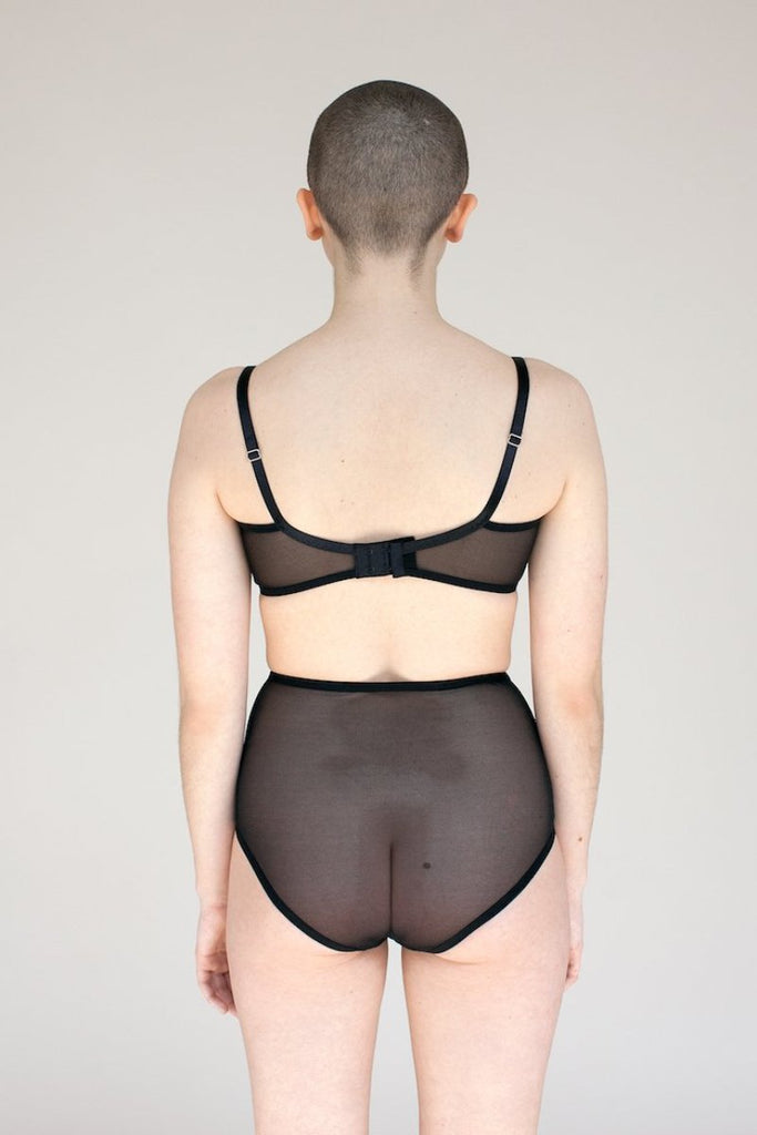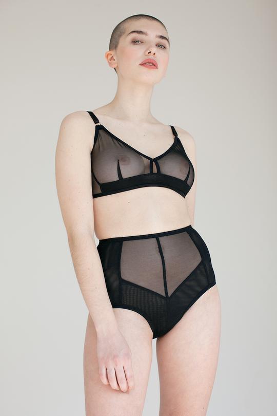 The Bully Boy Brick Bra is a sheer, wireless black bra with two centre darts over the bust and a triangle cut out in the centre front. 'Beautiful, flattering and sexy.'