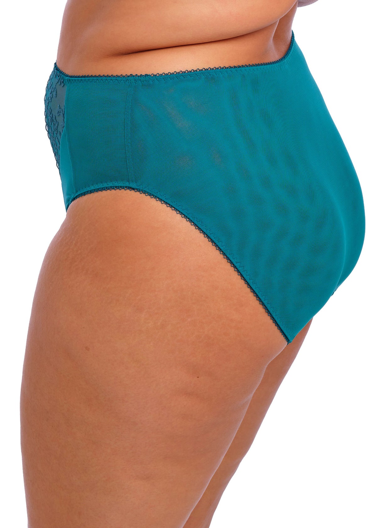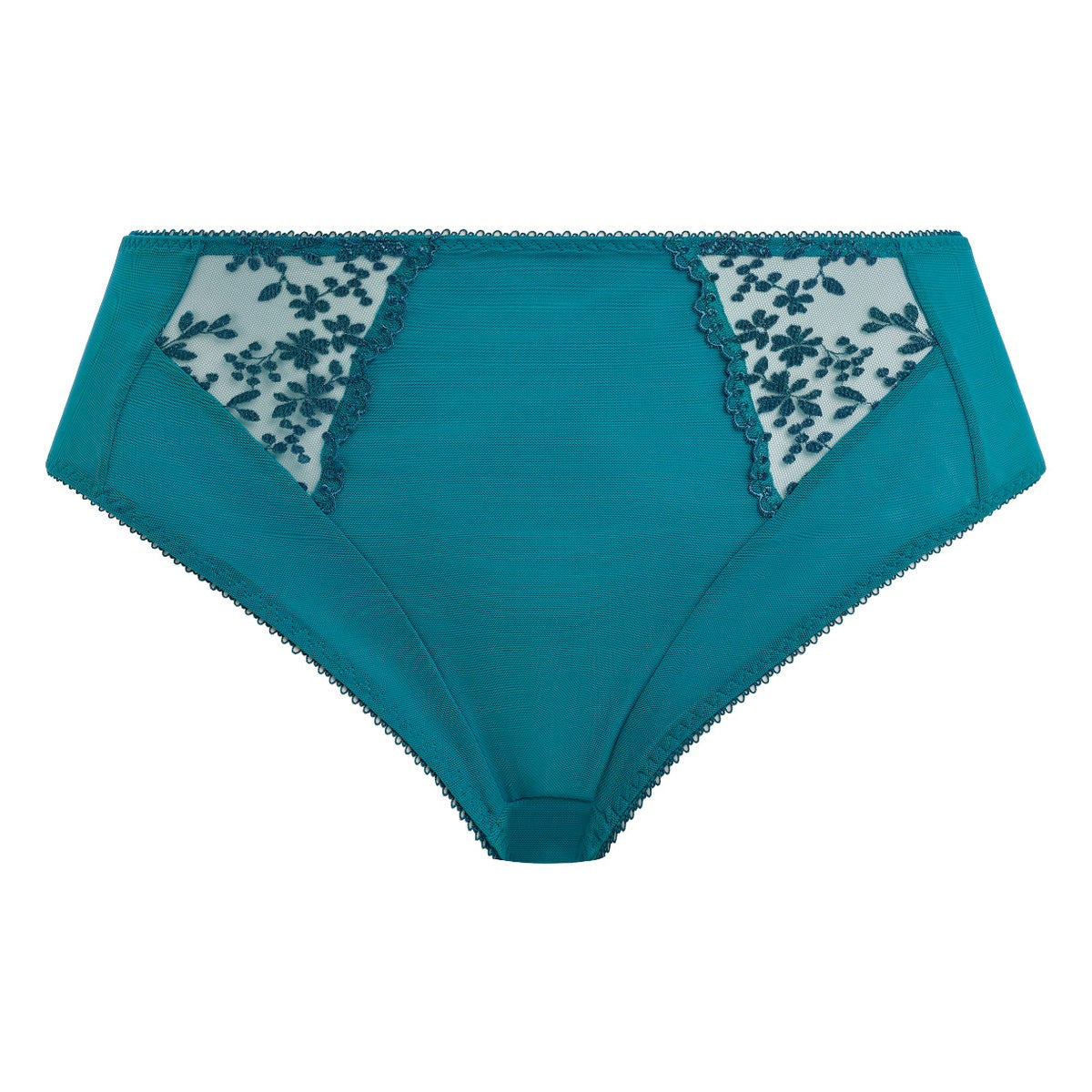 Fall in love with Elomi’s Zarla High Leg Brief in vibrant Ocean Depths Teal. Offering the perfect high-rise coverage, the briefs are adorned with abstract leaf and berry embroidery in a flat stitch across the front panels for minimal show through.