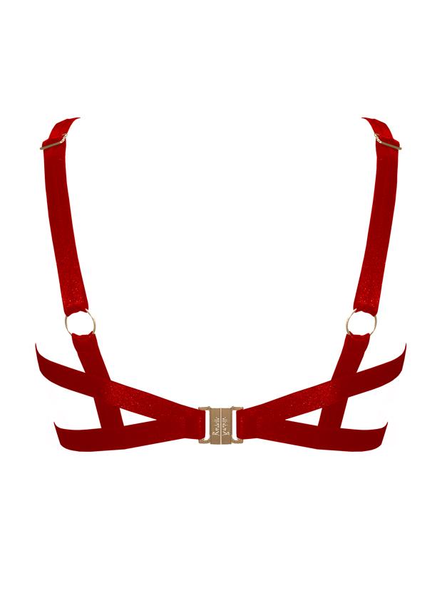 Frame your best features with the Bondage-Belle Frame Bra! This style is completely cupless and wireless, which lends it a lot of versatility. Layer it over a sexy outfit, another bra, or be daring and wear it with nothing at all! This style works great for bosoms both petite and plentiful, and has fully adjustable shoulder straps. The frame is held together with an 24k gold plated ring at the sternum. It is embellished with additional straps and rings that stretch across the top of the open cup. An open gate back ensures a great rear view. You will be irresistible!