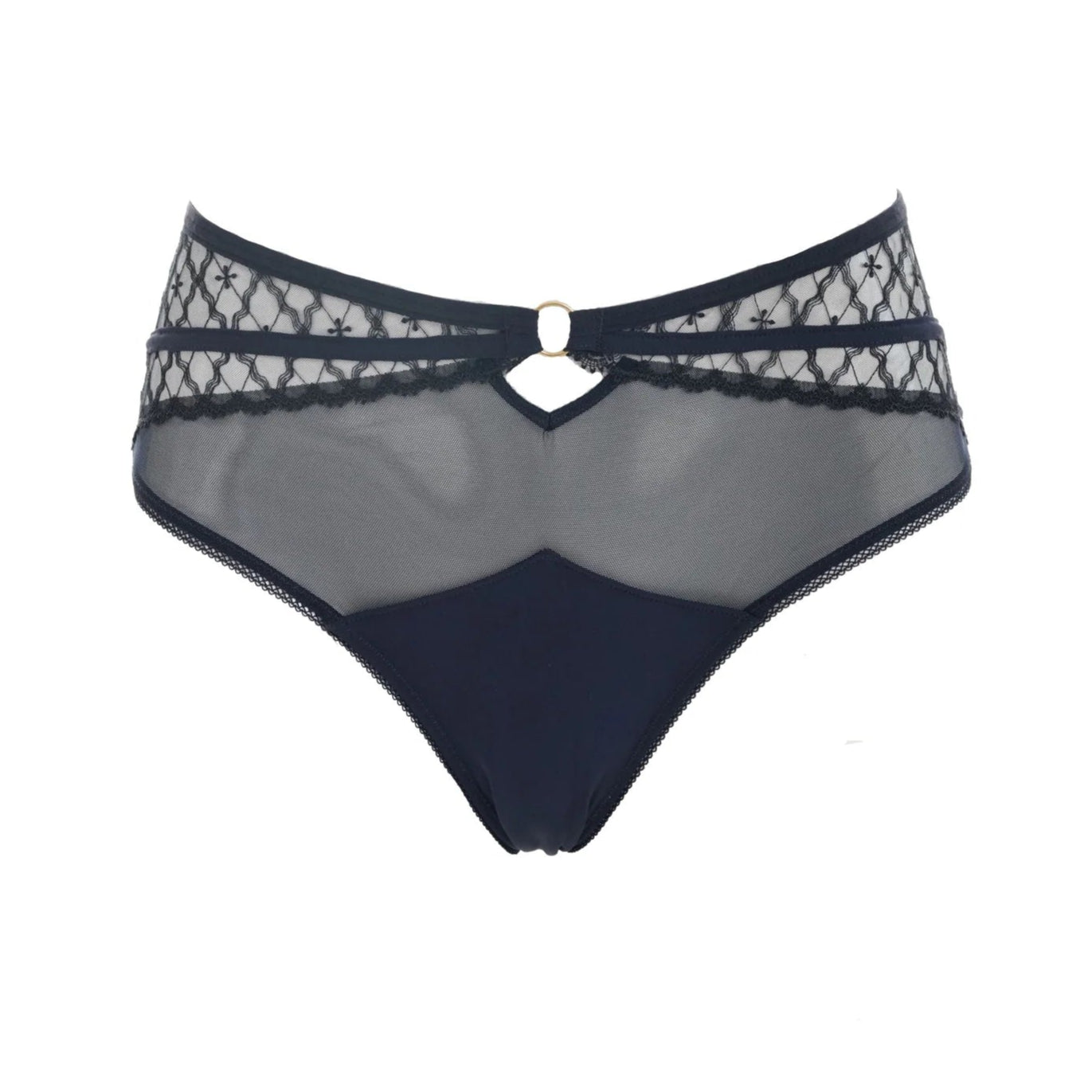 Its carefully placed geometric pattern enhances the silhouette with a modern touch. A golden ring at the center adds a trendy and sophisticated detail. At the back, the lightweight tulle offers a sensual and discreet finish, while the elastic pico around the thighs ensures a perfect fit.