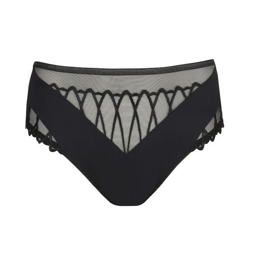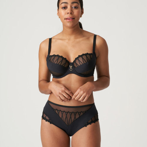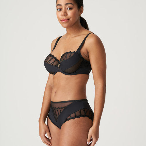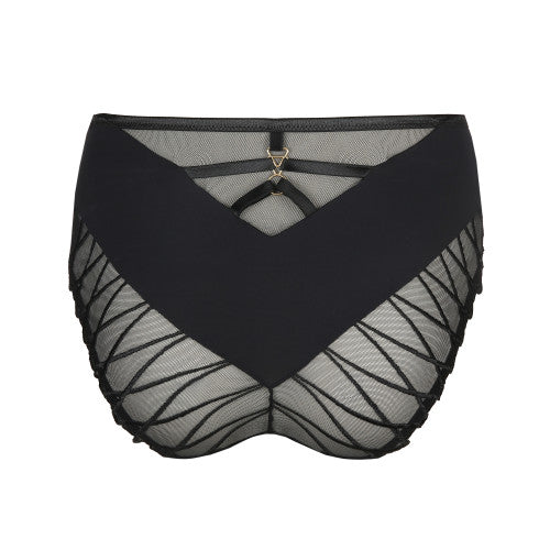 Prima Donna Arthill full Brief is a sexy high-waisted brief made from sheer tulle with graphic embroidery. A wide satin-look panel continues from front to back, following the shape of your hips. The back is entirely sheer. Black satin and sheer tulle. Sexy and chic!